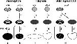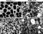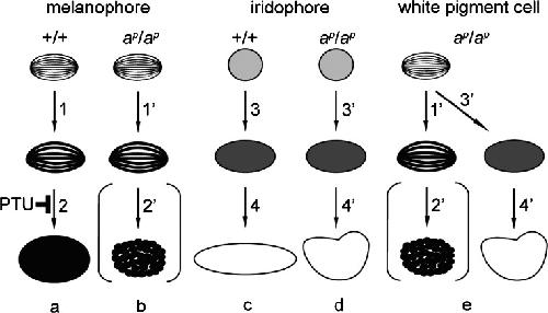 Fig. 9. Representation of pigment organellogenesis in melanophores (a, b), iridophores (c, d), and white pigment cells (e). a, b Melanosome formation in wild type (a) and mutant (b) melanophores. c, d Reflecting platelet formation in wild type (c) and mutant (d) iridophores. e Pigment organellogenesis in white pigment cells in the mutant. In wild type melanophores, melanin deposition occurs in stage II melanosomes to form partially melanized stage III melanosomes (a, 1) and then fully melanized stage IV melanosomes are formed (a, 2). Melanin is also deposited in stage II melanosomes to form stage III melanosomes (b, 1’) in mutant melanophores; however, few melanosomes become fully melanized (b, 2’). PTU inhibits melanosome maturation from stage III melanosomes to stage IV melanosomes in melanophores. In wild type iridophores, spherical vesicles with electron-dense material accumulate crystals (c, 3), which grow larger and exhibit rectangular reflecting platelets (c, 4). Crystals are also accumulated in spherical vesicles with electron-dense material in mutant iridophores (d, 3’); however, reflecting platelets become irregular in shape (d, 4’). In white pigment cells, melanosome formation (e, 1’, 2’) occurs in the same manner as described in mutant melanophores (b, 1’, 2’). In addition, some stage II melanosomes accumulate crystals in white pigment cells (e, 3’), and irregular-shaped reflecting platelets are formed (e, 4’) |