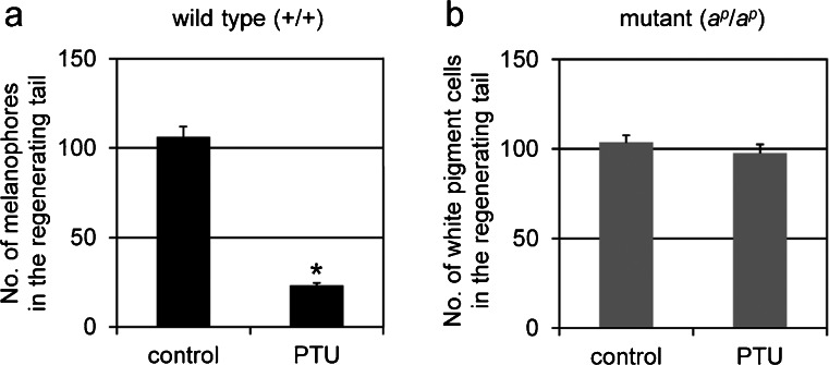 Fig. 2. Effect of PTU on the number of differentiated pigment cells in the 5-day regenerating tail of the wild type (a) and the mutant (b); amputated at stage 50. a Melanophores were counted in the wild type regenerating tail in the absence (control; nâ=â24) or presence (PTU; nâ=â21) of PTU. b White pigment cells were counted in the mutant regenerating tail in the absence (control; nâ=â18) or presence (PTU; nâ=â15) of PTU. The number of melanophores in the wild type regenerating tail in the presence of PTU was statistically different from that in the absence of PTU (t-test, *Pâ<â0.001). However, the number of white pigment cells in the mutant regenerating tail in the presence of PTU was not statistically different from that in the absence of PTU (t-test, Pâ>â0.3) |