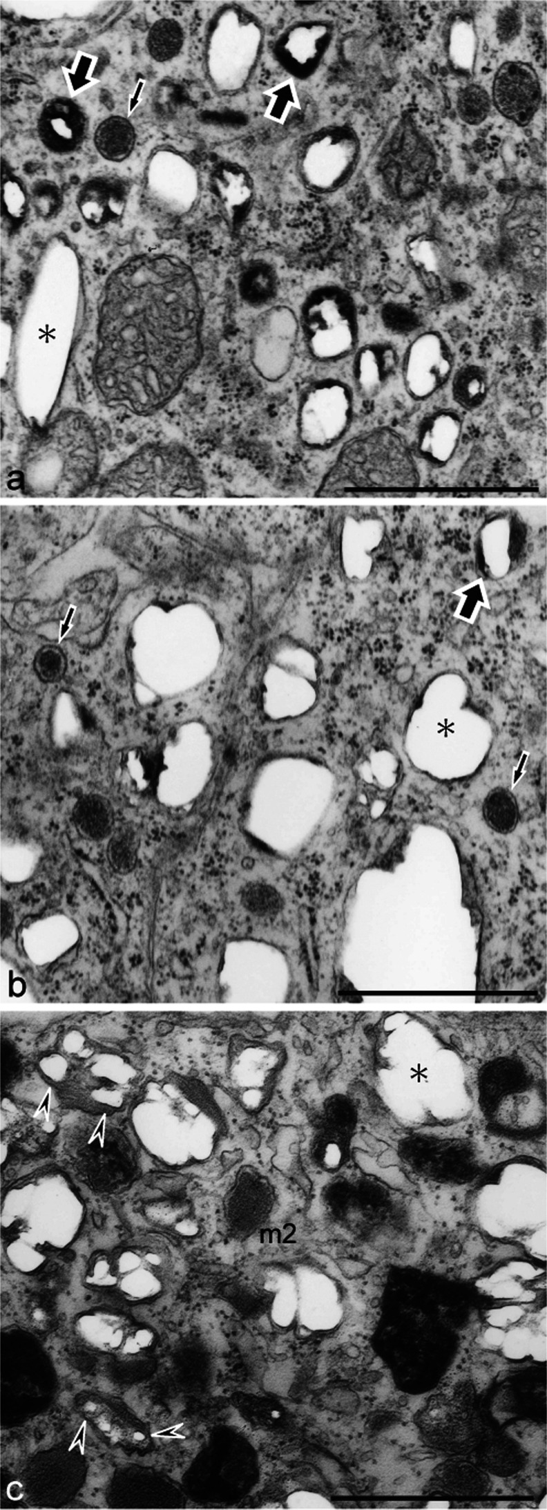 Fig. 5. Reflecting platelet organellogenesis in iridophores and white pigment cells. a, b Ultrastructure of wild type (a) and mutant (b) iridophores that were allowed to differentiate in culture. c Ultrastructure of white pigment cells in the mutant regenerating tail. Spherical vesicles with electron-dense material (a, b, small arrows) were present in both wild type and mutant iridophores. Spherical vesicles subsequently accumulated crystals that were lost partially during fixation and thin-sectioning, leaving âpartial holesâ (large arrows) in the sections. Mature reflecting platelets were characterized by âempty holesâ (asterisk). Reflecting platelets of wild type iridophores were rectangular (a, asterisk); however, those of mutant iridophores were irregular in size and shape (b, asterisk). White pigment cells in the mutant contained irregular-shaped reflecting platelets (c, asterisk) and stage II melanosomes with internal lamellar structures (m2). Note that reflecting platelets in white pigment cells were formed from stage II melanosomes (c, arrowheads), but not from spherical vesicles that were observed in iridophores (b). Barâ1 μm |