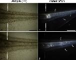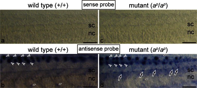 Fig. 6. Spatial expression of the ferritin H subunit mRNA in the middle region of the tail in the wild type (a, b) and the mutant (c, d) at stage 48. Whole mount in situ hybridization (WISH) was performed by using sense (a, c) or antisense (b, d) digoxigenin (DIG)-labeled RNA probes. Tadpoles were bleached to remove melanin before hybridization in this experiment. With a sense probe of the ferritin H subunit mRNA, no staining was observed in the tail of both the wild type (a) and the mutant (c) in the negative control. Use of an antisense probe in WISH detected strong staining in the lateral lines (arrowheads) of both the wild type (b) and the mutant (d). In addition, specific expression of the ferritin H subunit mRNA was detected in white pigment cells (d, large arrows), which were present around the dorsal side of the spinal cord (sc) in the mutant (nc notochord). Although melanophores were present around the dorsal side of the spinal cord in the wild type, no staining was observed in melanophores (b). Note that staining was also detected in some epidermal cells (small arrows) in both the wild type (b) and the mutant (d). Barâ100 μm |