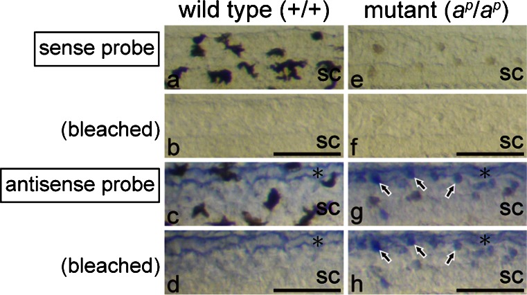Fig. 7. Expression of the ferritin H subunit mRNA in white pigment cells but not in melanophores. Photographs of the posterior region of the wild type tail (a-d) and the mutant tail (e-h) at stage 48. WISH was performed with sense (a, b, e, f) or antisense (c, d, g, h) DIG-labeled RNA probes (sc spinal cord). Tadpoles were bleached after BM purple staining. The same fields before (a, c, e, g) and after (b, d, f, h) bleaching are shown. In the negative control, with a sense probe of the ferritin H subunit mRNA, no staining was observed in the tail of the wild type (a, b) or the mutant (e, f). Before bleaching, dendritic black melanophores (a) were distinguished from punctate white pigment cells (e), which appeared brown under transmitted light. Melanin was bleached effectively in both melanophores (b) and white pigment cells (f). Staining with an antisense probe indicated that white pigment cells (g, h, arrows), but not melanophores (c, d), expressed the ferritin H subunit mRNA. Note that staining was also detected in the dorsal longitudinal anastomosing vessel (asterisks) in both the wild type (c, d) and the mutant (g, h). Barâ100 μm |