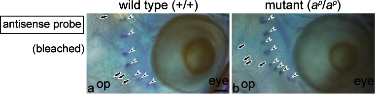 Fig. 8. Ferritin H subunit mRNA is not expressed in the eye in the wild type (a) and the mutant (b) at stage 48. WISH was performed with sense (not shown) or antisense DIG-labeled RNA probes, and tadpoles were bleached after BM purple staining (op olfactory pit). No staining was observed in the eye in either the wild type (a) or the mutant (b). In contrast, expression of the ferritin H subunit mRNA was detected in the lateral lines (arrowheads) and some epidermal cells (arrows). Barâ100 μm |