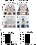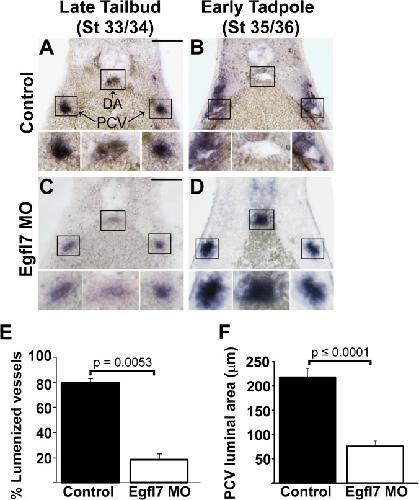 Fig 4. EGFL7 is required for lumen formation.(A-D). In situ hybridization with endothelial-specific Erg shows a requirement for EGFL7 in lumen formation of the dorsal aorta (DA) and posterior cardinal veins (PCV). (A). Endothelial cells coalesce at the appropriate positions of the DA and PCVs in late tailbud stage (stage 33/34) control embryos. (B). DA and PCV lumens become evident by early tadpole stage (stage 35/36) in control embryos. (C). Endothelial cells appear as aggregates in late tailbud stage (stage 33/34) EGFL7-depleted vessels similar to controls. (D). Lumens fail to form in early tadpole stage (stage 35/36) EGFL7-depleted embryos. 3â4 embryos from each condition/stage were assessed from at least three independent injection batches at the same position along the anterior-posterior axis of the embryo. Top image of each panel was taken at 20x magnification. Black boxes correspond to enlarged images of each vessel displayed below. Scale bars represent 20 μm. (E). Frequency of lumenized PCVs and DAs in early tadpole stage (stage 35/36) embryos. Lumens are detected in 81% of control embryos vs. 21% of EGFL7-depleted embryos. n = 209 control, n = 216 MO, three independent experiments. Student's t-test was used to calculate the p-value and bars represent ± SEM. (F). Measurement of the luminal area within the PCV in early tadpole stage (stage 35/36) embryos. The size of control lumens = 218 μm. Of EGFL7-depleted vessels that were lumenized, lumens were significantly smaller,75 μm. n = 70 control, n = 29 MO. A Mann-Whitney test was used to determine significance and bars represent ± SEM. |