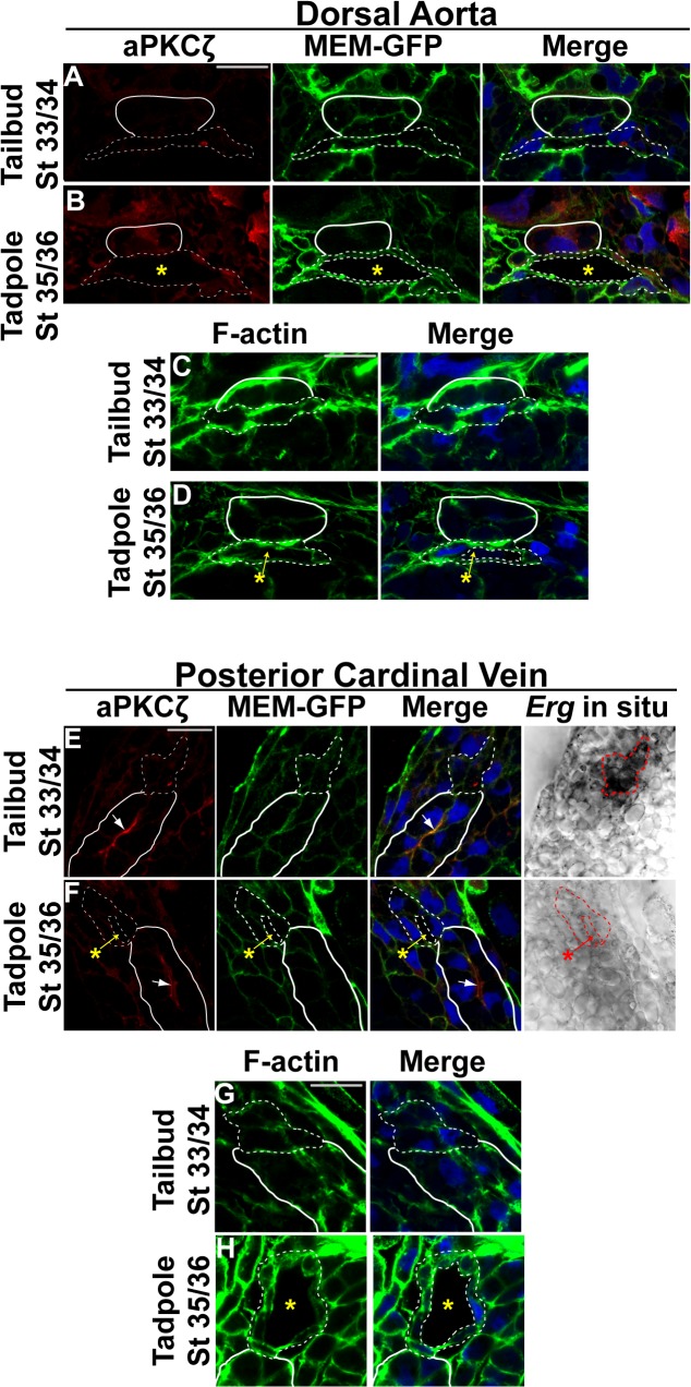 Fig 3. Apical polarity is not established in Xenopus vessels.(A-H). Representative confocal images of transverse sections of the dorsal aorta (DA) and posterior cardinal veins (PCV) stained with atypical PKCζ (aPKCζ; red), GFP to mark cell membranes (MEM-GFP; green), and DAPI to mark nuclei (blue; A,B,E,F) or Phalloidin to mark F-actin (green) and DAPI (blue; C,D,G,H). Phase contrast images for the PCVs in (E) and (F) represent the Erg in situ signal. All images taken at 63x magnification with scale bars indicating 20 μm. Dotted white and red lines in all panels delineate the endothelial cells comprising each vessel. As anatomical references, the hypochord in (A-D) and the kidney in (E-H) are indicated by solid white lines. Asterisks denote the vessel lumen. (A-B). aPKCζ enrichment is absent from the cell-cell contact in late tailbud stage (stage 33/34) control embryos and the apical membrane of the DA of early tadpole stage (stage 35/36) control embryos. 3â4 embryos from each condition/stage were assessed from at least three independent injection batches at the same position along the anterior-posterior axis of the embryo. (C-D). F-actin fails to localize to the cell-cell contact or apical surface of the dorsal aorta at late tailbud and early tadpole stages. (E-F). aPKCζ can readily be detected on the apical surface of the kidney (arrow) but not at the cell-cell contact or apical membrane of the PCV at late tailbud (stage 33/34) or early tadpole stages (stage 35/36). (G-H). F-actin is evenly distributed in venous endothelial cells. 3â4 embryos from each condition/stage were assessed from at least two independent injection batches at the same position along the anterior-posterior axis of the embryo. |