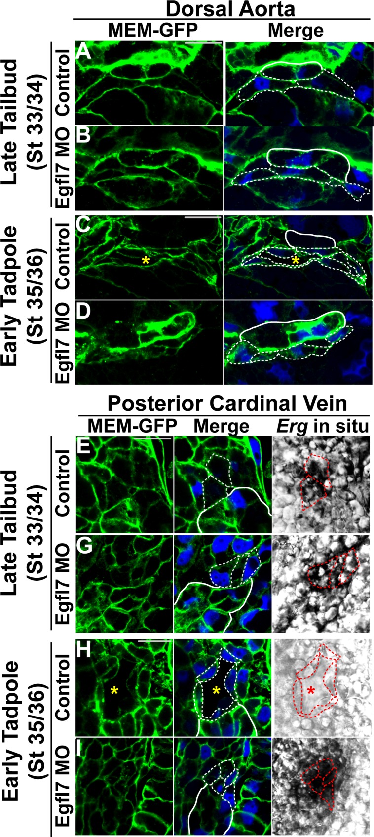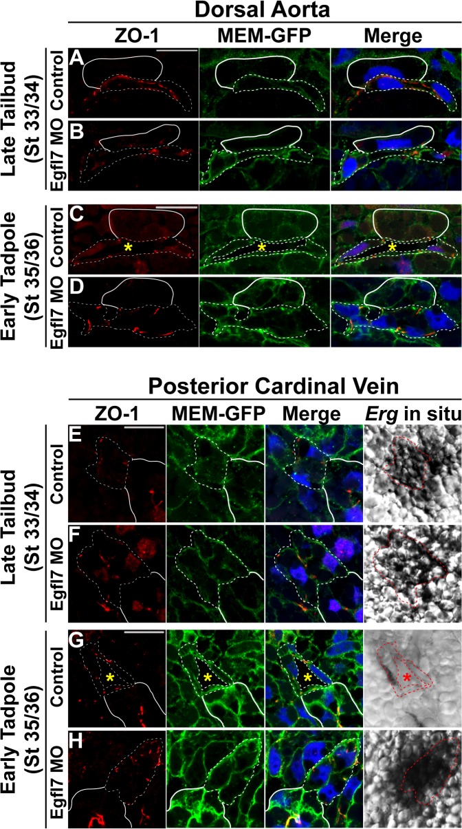 Fig 5. Cellular morphology of endothelial cells undergoing lumen formation.(A-H). Representative confocal images of transverse sections of the dorsal aorta (DA) and posterior cardinal veins (PCV) stained with GFP to mark cell membranes (MEM-GFP; green) and DAPI to mark nuclei (blue). Phase contrast images for the PCVs represent the Erg in situ signal. All images taken at 63x magnification with scale bars indicating 20 μm. Dotted white and red lines in all panels delineate individual endothelial cells. As anatomical references, the hypochord in (A-D) and the kidney in (E-H) are indicated by solid white lines. (A). Endothelial cells of the DA are oblong-shaped at late tailbud stage (stage 33/34) control embryos. (B). Endothelial cells of late tailbud stage (stage 33/34) EGFL7-depleted DAs display a similar morphology to controls. (C). Endothelial cells elongate during DA lumen formation in early tadpole stage (stage 35/36) control embryos. (D). Endothelial cells of the DA remain oblong-shaped and do not elongate to accommodate the vascular lumen in early tadpole stage (stage 35/36) EGFL7-depleted embryos. (E). Endothelial cells of the PCVs have a polygonal cobblestone-like shape in late tailbud stage (stage 33/34) control embryos. (F). Endothelial cells of late tailbud stage (stage 33/34) EGFL7-depleted PCVs are similarly shaped as controls. (G). Endothelial cells elongate, becoming narrower as PCV lumens form by early tadpole stage (stage 35/36) control embryos. (H). Endothelial cells of the PCVs retain their polygonal morphology in early tadpole stage (stage 35/36) EGFL7-depleted embryos. 3â4 embryos from each condition/stage were assessed from at least three independent injection batches at the same position along the anterior-posterior axis of the embryo. |