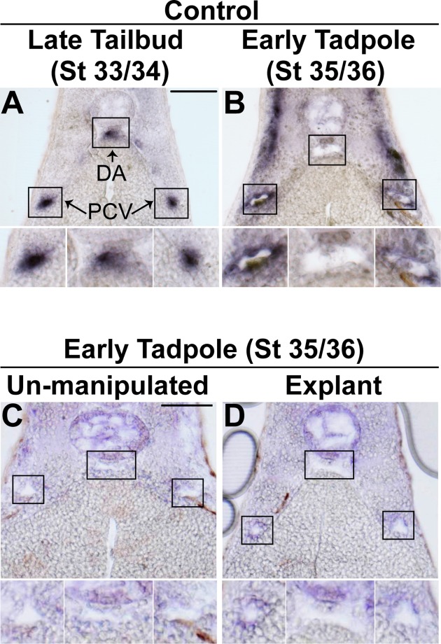 Fig 1. Vascular lumen formation proceeds independently of circulation in Xenopus.(A-B). In situ hybridization with endothelial-specific Erg followed by sectioning was performed to determine the time course of vascular lumen formation of the dorsal aorta (DA) and posterior cardinal veins (PCV) in Xenopus. (A). Endothelial cells are coalesced together at the correct positions of the DA and PCVs in late tailbud stage (stage 33/34) control embryos. (B). Lumenized DA and PCVs become apparent by early tadpole stage (stage 35/36) in control embryos. 3â4 embryos from each condition/stage were assessed from at least three independent injection batches at the same position along the anterior-posterior axis of the embryo. (C-D). In situ hybridization with Erg followed by sectioning. (C). Transverse section of an early tadpole stage (stage 35/36) wildtype embryo depicting lumenized DA and PCVs. (D). Following the removal of the anterior and heart of early tailbud embryos, explants were cultured until early tadpole stage (stage 35/36) and processed as indicated above. PCV and DA lumens readily form in the absence of a functioning heart or circulatory system. 3â4 embryos from each condition were assessed from two independent experiments. Top image of each panel was taken at 20x magnification. Black boxes correspond to enlarged images of each vessel displayed below. Scale bars represent 20 μm. |