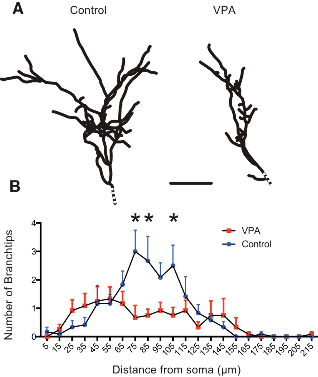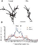 Figure 2. Abnormal dendritic morphology in VPA-reared tadpoles. A, Reconstructed dendritic arbors from representative tectal neurons from control and VPA-exposed tadpoles show different branching structure. Dotted line indicates the position of the soma. B, Three-dimensional Sholl analysis indicating the number of branch tips at different distances from the soma. Notice the differences in branch-tip distribution. Each group represents an average of 12 (control) and 13 (VPA) neurons, and error bars are SD. *p < 0.05. |