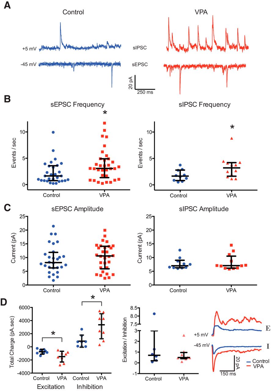 Figure 3. VPA exposure enhances spontaneous and evoked excitation and inhibition in the tectum. A, Example sEPSCs and sIPSCs recorded at 5 and −60 mV, respectively, from control and VPA-treated tadpoles. B, Frequency of sEPSCs and sIPSCs are significantly enhanced in the VPA group. C, Plot of sEPSC and sIPSC amplitudes from both groups show no difference. D, Total charge from evoked synaptic responses over a 100 ms window for both EPSCs and IPSCs for both experimental groups (left) and E/I ratios. Although evoked currents are larger in VPA tadpoles, the E/I ratio is unchanged. The inset shows sample EPSC and IPSC traces. Error bars are IQRs and medians. *p < 0.05. |