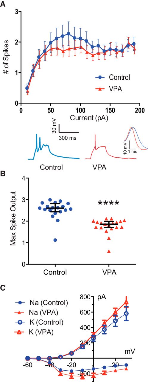 Figure 6. Exposure to VPA decreases intrinsic excitability in tectal neurons. A, Reduced intrinsic cell excitability. Line graph depicting number of evoked spikes as a function of injected current steps. Control, n = 17; VPA, n = 14. The inset shows sample responses to a depolarizing current injection. B, Scatter plot depicting the maximum spike output for each cell. p = 0.0001, N = 19. Error bars are IQRs. C, I–V plot depicting Na+ and K+ currents. Control, n = 21; VPA, n = 21. *p < 0.001. |