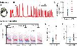 VPA-reared tadpoles exhibit increased seizure susceptibility and decreased acoustic startle habituation. A, A typical C-shaped bend exhibited by tadpoles during pharmacologically induced seizures. B, A sample trace of swimming speed evolution during a seizure protocol; onset of regular seizures is marked with an arrow. C, Comparison of seizures frequency during the first 5 min of testing for control (blue) and VPA-reared (red) tadpoles. All data, medians, and 20â80% quantiles are shown. D, Speed of acoustic startle responses in the acoustic habituation protocol; the plot shows all data points and averages across all tested animals in each group. Brackets on the top illustrate segments of data that were averaged and compared for each tadpole to produce estimations of rapid, short-term, and long-term habituation. E, Comparison of short-term habituation amount, defined as the ratio of average startle response amplitudes at different stages of habituation protocol (see Results), for control (blue) and VPA-reared (red) tadpoles. F, Comparison of long-term habituation amount for control and VPA-reared tadpoles. *p < 0.05. |