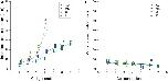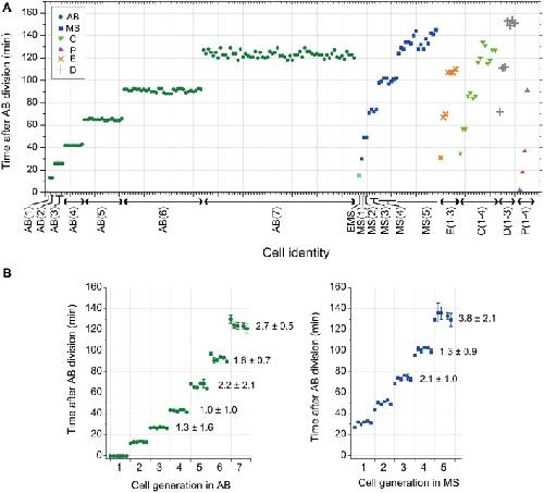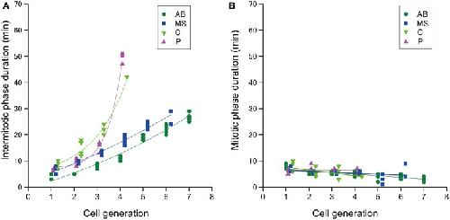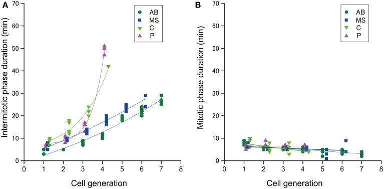 Figure 4. The duration of cell cycle phases in C. elegans embryos. The duration of the (A) intermitotic phase or (B) mitotic phase in the size-correlated class; AB (green dot), MS (blue square), C (light green triangle), and P (magenta triangle) lineages are shown in linear plots in the vertical axis. The cell generations in each founder cell lineage are shown in the horizontal axis. Data points are displaced along the horizontal axis to avoid overlap (A,B). This data displacement does not affect exponentiation of data. Duration data were obtained from three wild-type embryos. |