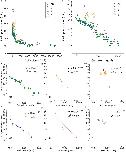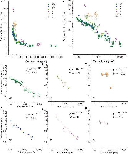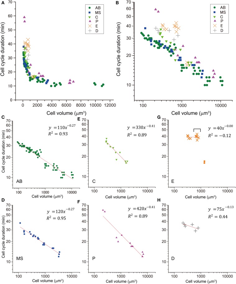 Figure 2. Relationship between cell cycle duration and cell volume. This relationship of cells in embryos is shown in a double logarithmic plot (A) and a linear plot (B). The relationship of cells in AB [green dot, (C)], MS [blue square, (D)], C [light green triangle, (E)], P [magenta triangle, (F)], E [orange x-mark, (G)], and D [gray cross, (H)] lineages are shown in the double logarithmic plot. Cell volume and cell cycle duration data were obtained from four wild-type embryos. Data in the logarithmic scale were fitted to the formula, y = a + bx, by the linear least-squares method. (G) E cells are indicated by squares, and their descendants are indicated by orange x-marks. Downward bracket indicates the daughter cells of E cells. Regression analysis of cells in E lineage was performed without the E cells. Degrees of freedom in fitting in (C–H) were 68, 19, 10, 11, 8, and 4, respectively. |