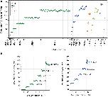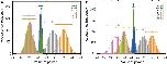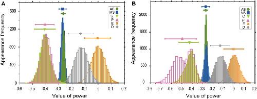 Figure 3. Powers of the T–V relationship could be classified into three classes. T–V relationships in each lineage in the logarithmic (A) or linear (B) scale were fitted by a power law model. Statistical analysis combining regression analysis and a bootstrap method were performed 10,000 times, using the same data used in Figure 2. The estimated power is indicated in the horizontal axis, while the appearance frequencies of the values of power is indicated in the vertical axis. The 95% CIs of the power of the T–V relationship were determined by the appearance frequency and are shown by long horizontal bars. Data for AB, MS, C, P, E, and D lineages are shown in green, blue, light green, magenta, orange, and gray, respectively. |