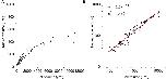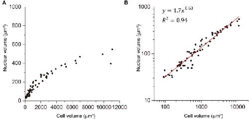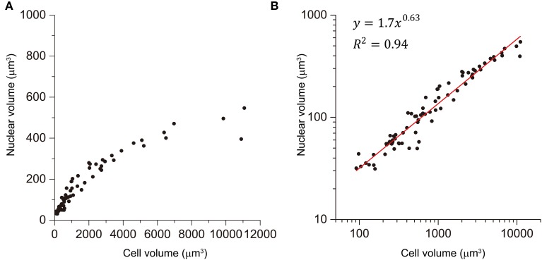 Figure 5. Power law relationship between the nuclear and cell volume. Relationship between nuclear and cell volume in size-correlated classes (AB, MS, C, and P) is shown in linear (A) and double logarithmic (B) plots. Cell volumes were determined by the integral approach with error correction, whereas nuclear volumes were determined by the formula approach in three wild-type embryos. Data in logarithmic scale were fitted to the formula, y = a + bx, by the linear least-squares method. Degree of freedom in fitting was 75. |