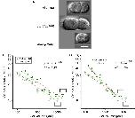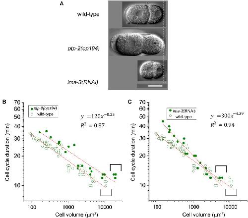Figure 6. Relationship between cell cycle duration and cell volume in loss-of-function embryos. (A) Images of embryos at the two-cell stage for wild-type, ptp-2(op194), and ima-3 RNAi embryos were obtained by differential interference contrast (DIC) microscopy. Scale bar = 20 μm. Relationship between cell cycle duration and cell volume in AB lineage in ptp-2(op194) [filled circles in (B)] and ima-3(RNAi) [filled circles in (C)] embryos are shown with that in wild-type embryos [open circles in (B,C)] in double logarithmic plots. Cell volume and cell cycle duration data in loss-of-function embryos were obtained from each of three embryos. Data in the logarithmic scale were fitted to the formula, y = a + bx, by the linear least-squares method. Degrees of freedom in fitting (B,C) were 19 and 19, respectively. |