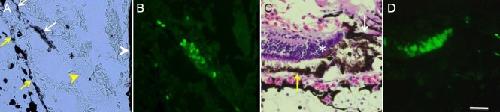 Figure 2. BrdU labeling of stem/progenitor cells at the early stage of regeneration (day 5) (A, B) and late stage (day 20) (C, D).(A, B) At the early stage, there is an actively proliferating cell zone (asterisk in A) juxtaposed to the presumable ciliary marginal zone (CMZ) (yellow arrowhead) and the iris (white arrowhead). This proliferating cell zone (progenitor cells) appear continuous to the newly formed retinal pigmented epithelial (RPE) layer (white arrow). The original RPE layer is shown by yellow arrows. A is a phase contrast micrograph image and is identical to B. (C, D) At the later stage, there is another progenitor cell clusters (asterisk) at the posterior end of regenerating retina. There still remain some RPE cells (white arrow). The original RPE is shown by a yellow arrow. C is a micrograph of a section stained with hematoxylin and eosin, and is identical to D. Scale bar in D is 45 μm and applied to AâC.