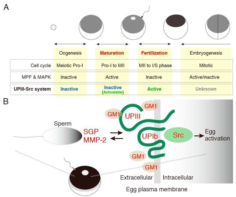 Fertilization is a cell biological phenomenon of crucial importance for the birth of new life in a variety of multicellular and sexual reproduction species such as algae, animal and plants. Fertilization involves a sequence of events, in which the female gamete "egg" and the male gamete "spermatozoon (sperm)" develop, acquire their functions, meet and fuse with each other, to initiate embryonic and zygotic development. Here, it will be briefly reviewed how oocyte cytoplasmic components are orchestrated to undergo hormone-induced oocyte maturation and sperm-induced activation of development. I then review how sperm-egg membrane interaction/fusion and activation of development in the fertilized egg are accomplished and regulated through egg coat- or egg plasma membrane-associated components, highlighting recent findings and future directions in the studies using Xenopus laevis as a model experimental animal.