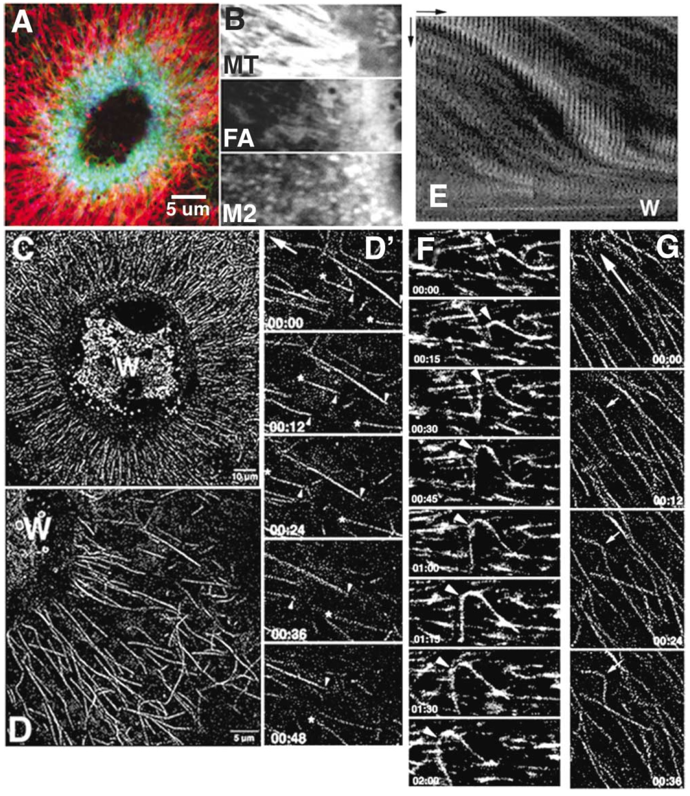 (E) Dual-label image from a movie showing microtubules (green) aligned with F-actin (red; alignment indicated by arrowheads).