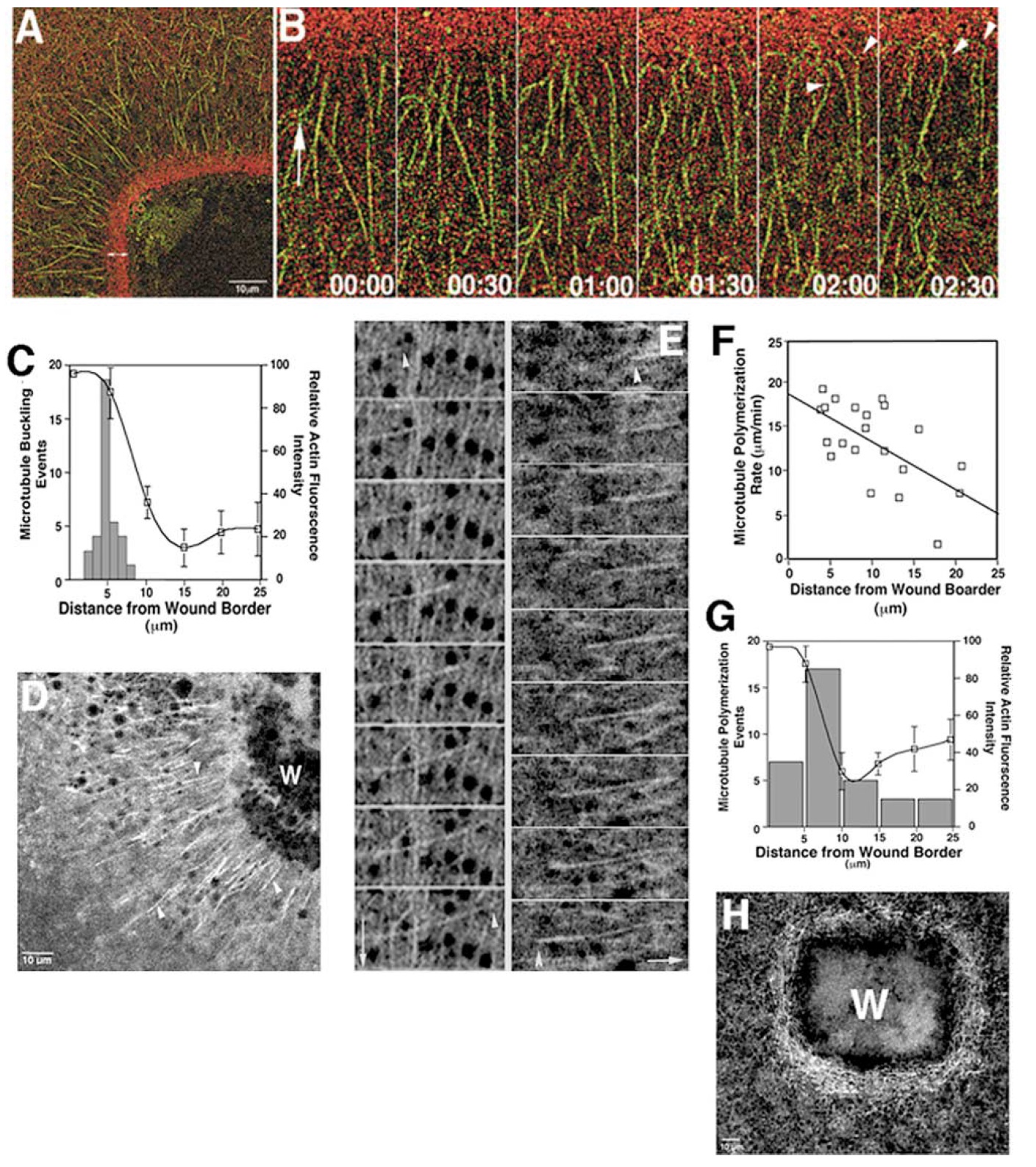 (C) Microtubules move to the wound (arrow) in association with F-actin and buckle upon reaching the wound edge (arrowheads). See Movie 6.