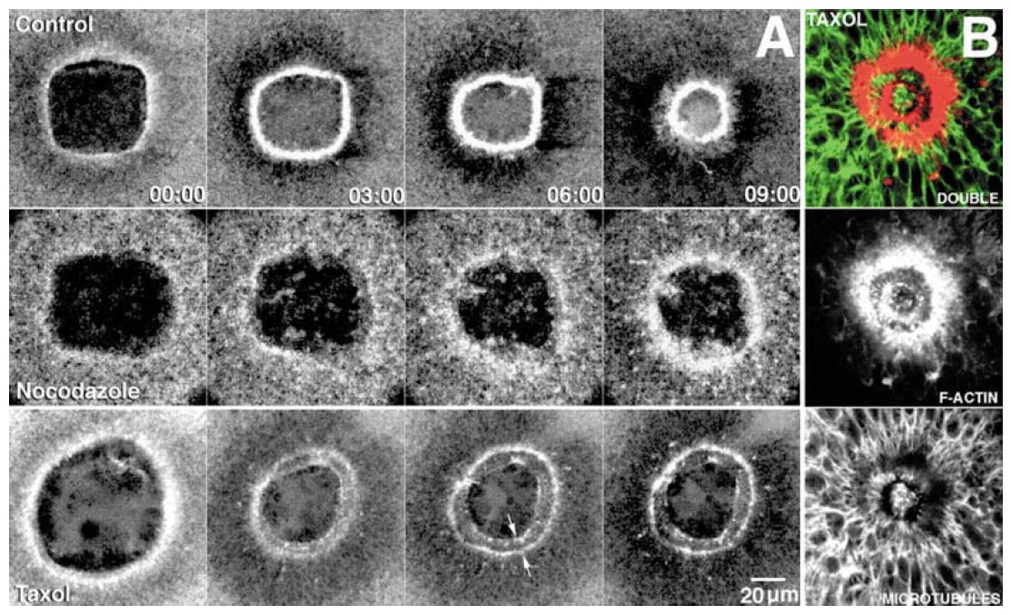 (B) Images from a movie of an OG-Tax-injected oocyte. Arrowheads show a microtubule translocating to the wound (W), until latrunclin