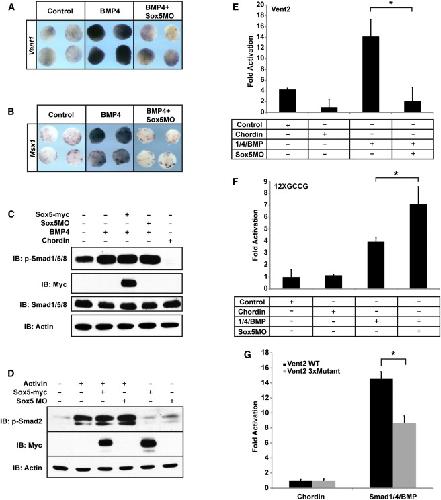 Figure 3. BMP Signaling Requires Sox5 to Activate Transcriptional Targets (A and B) Ectoderm explant assay examining Vent1 (A) and Msx1 (B) in explants injected with BMP4 mRNA or BMP4 mRNA with Sox5 MO. Explants were collected alongside sibling embryos cultured until early neurula stages (stage 14). (C) Western blot using lysates from embryos injected either with BMP4, BMP4/Sox5, BMP4/Sox5MO, or Chordin to examine levels of phosphorylated Smad1 and unphosphorylated Smad1. (D) Western blot using using lysates from embryos injected with Activin, Activin/Sox5, Activin/Sox5MO, Sox5, or Sox5MO to examine levels of phosphorylated Smad2. (E and F) Luciferase assay examining fold activation by the Vent2 promoter, p = 0.0068 (E), or 12XGCCG reporter, p = 0.0227 (F), in the presence of active Smad1/4 complexes or with active Smad1/4 and Sox5 MO. (G) Luciferase assay using the Vent2 reporter and the Vent2 3x Mutant reporter (carrying the same mutations as in Figure S3C). The mutations that reduce Sox5 binding also reduce activation of the reporter by active Smad1/4. Error bars represent SD of three independent experiments. See also Figure S3. |