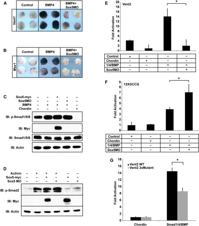 The SoxD factor, Sox5, is expressed in ectodermal cells at times and places where BMP signaling is active, including the cells of the animal hemisphere at blastula stages and the neural plate border and neural crest at neurula stages. Sox5 is required for proper ectoderm development, and deficient embryos display patterning defects characteristic of perturbations of BMP signaling, including loss of neural crest and epidermis and expansion of the neural plate. We show that Sox5 is essential for activation of BMP target genes in embryos and explants, that it physically interacts with BMP R-Smads, and that it is essential for recruitment of Smad1/4 to BMP regulatory elements. Our findings identify Sox5 as the long-sought DNA-binding partner for BMP R-Smads essential to plasticity and pattern in the early ectoderm.