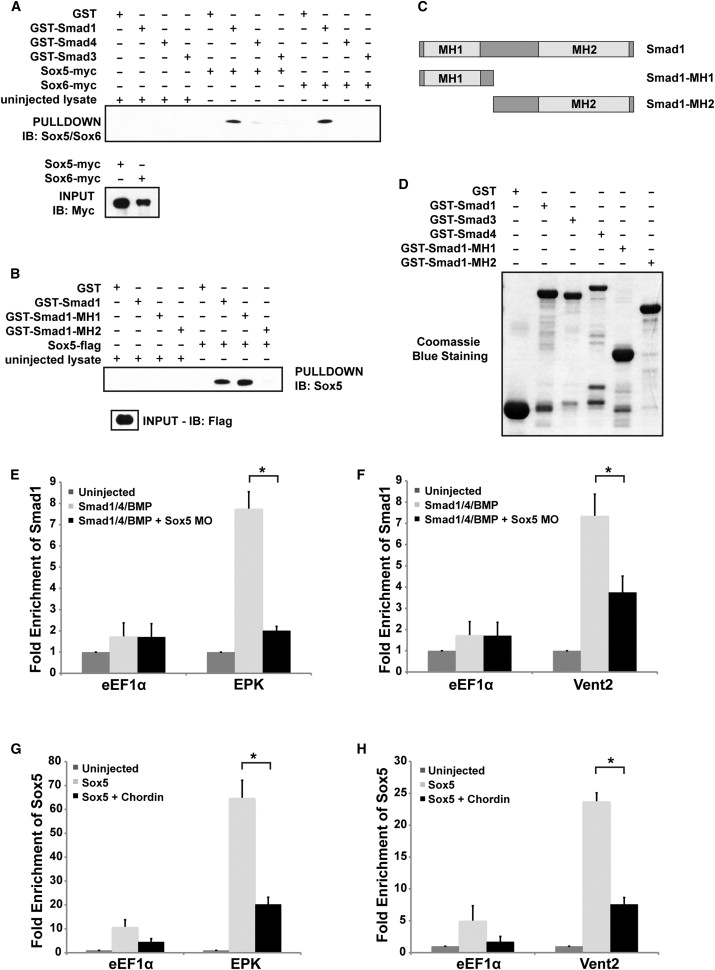 Figure 4. Sox5 Recruits Smad1/4 to Target Promoters through Physical Association (A) GST pull-down assay using lysates from uninjected embryos or embryos injected with Sox5 or Sox6 mRNA assaying for binding to GST, Smad1-GST, Smad3-GST, or Smad4-GST. Western blots show expressed levels of Sox5 and Sox6. (B) GST pull-down assay using lysates from embryos injected with Sox5 mRNA assaying for binding to GST, Smad1-GST, Smad1-MH1-GST, or Smad1-MH2-GST. (C) Schematic representations of Smad1, Smad1-MH1, and Smad1-MH2 constructs used in pull-down assays. (D) Coomassie staining of expressed GST fusion proteins used for pull-downs in (A) and (B). (E) ChIP-qPCR analysis of Smad1 enrichment on EPK promoter relative to eEF1α promoter. Smad1 enrichment is significantly reduced when Sox5 is depleted. Error bars represent SEM of three independent biological experiments. p = 0.0022. (F) ChIP q-PCR analysis of Smad1 enrichment on Vent2 promoter relative to control eEF1α promoter. Smad1 enrichment is significantly reduced when Sox5 is depleted. Error bars represent SEM of three independent biological experiments. p = 0.0472. (G) ChIP analysis examining Sox5 enrichment on EPK promoter relative to eEF1α promoter. Smad1 enrichment is significantly reduced in the presence of Chordin. Error bars represent SEM of three independent biological experiments. p = 0.0048. (H) ChIP analysis examining Sox5 enrichment on Vent2 promoter relative to eEF1α promoter. Sox5 enrichment is significantly reduced in the presence of Chordin. Error bars represent SEM of three biological experiments. p = 0.0006. See also Figure S4. |