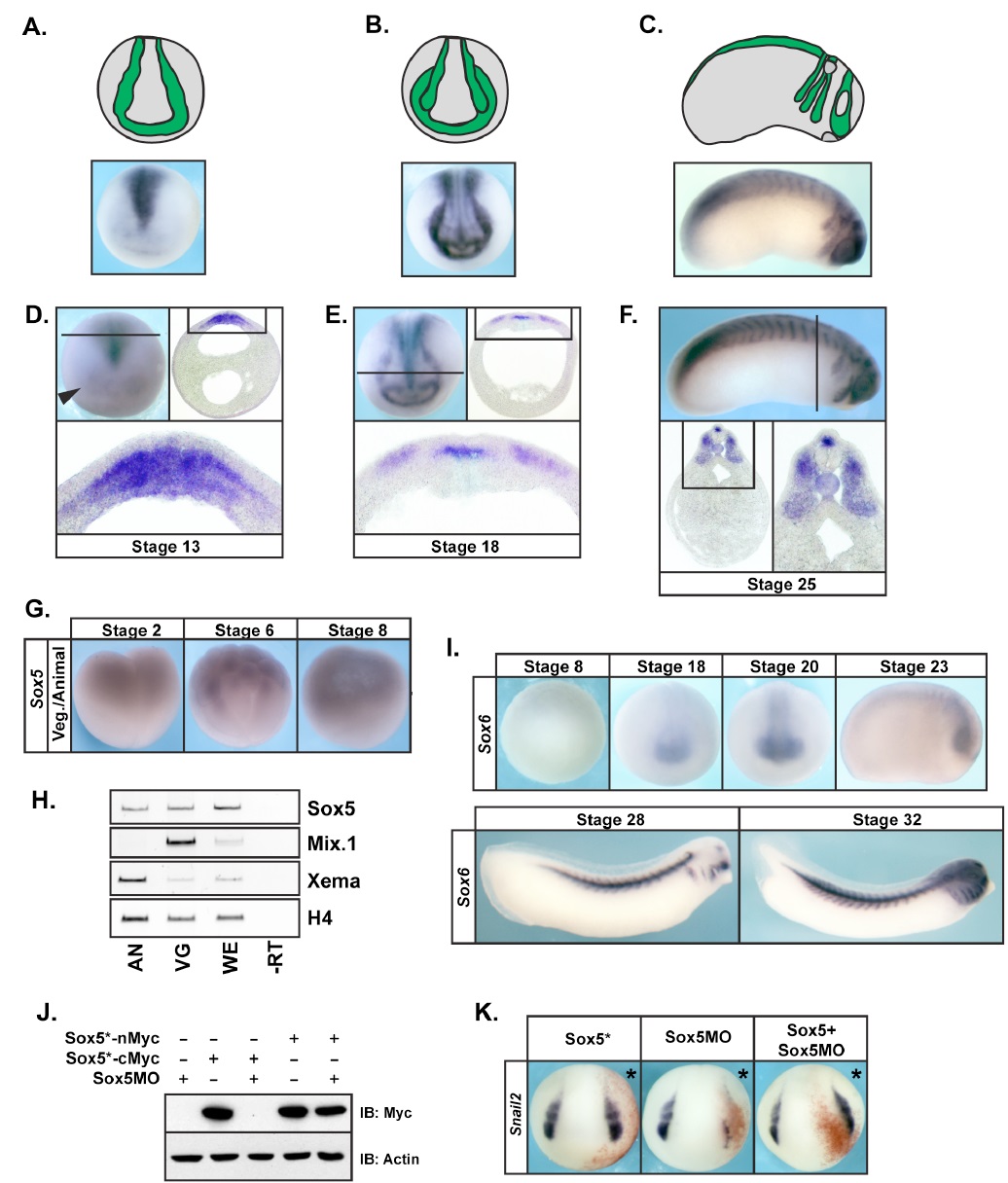 Figure S1. Related to Figure 1. Expression of Sox5 in wildtype embryos and Sox5 is effectively knocked down (A-C) In situ hybridization showing expression of Sox5 with schematics showing location (green) of NPB and premigratory and migratory NC cells at: (A) early neurula (stage 13) (B) mid-neurula (stage 18) (C) tailbud (stage 24) stages. At early neurula stages Sox5 is expressed in the somitic mesoderm and throughout the ectoderm. By stage 18 the pan-ectodermal expression has been lost and robust expression is seen at the NPB. (D-F) 60 μM serial sections through embryos following in situ hybridization for Sox5. Strong expression in mesoderm is seen at stage 13 (D) while expression in the neural crest can be seen at mid-neurula stages (E), and tailbud stages (F). (G) In situ hybridization of wildtype embryos showing Sox5 expression at the two cell (stage 2), morula (stage 6) and blastula (stage 8) stages. Maternal expression was also reported in a proteomics study (Yanai et al., 2011). (H) RT-PCR stage 9 animal pole explants, vegetal bottom explants and whole embryos Sox5 is expressed in both animal and vegetal explants whereas Mix.1 is expressed preferentially in the vegetal pole and Xema in the animal pole. Histone H4 was used to normalize cDNA input. (I) Wild type expression of Sox6 from stage 8 through stage 32. In contrast to Sox5, Sox6 lacks detectable early ectodermal/NC expression. (J) Western blot of lysates from embryos co-injected with Sox5 mRNA and Sox5 morpholino demonstrating that Sox5 translation is blocked by the morpholino. An N-terminally myc tagged Sox5 cannot be targeted by the morpholino. (K) In situ hybridization examining expression of Snail2 in embryos injected with Sox5 mRNA, Sox5 morpholino, or both. Coinjection of Sox5 mRNA rescues the effects of Sox5 morpholino. |