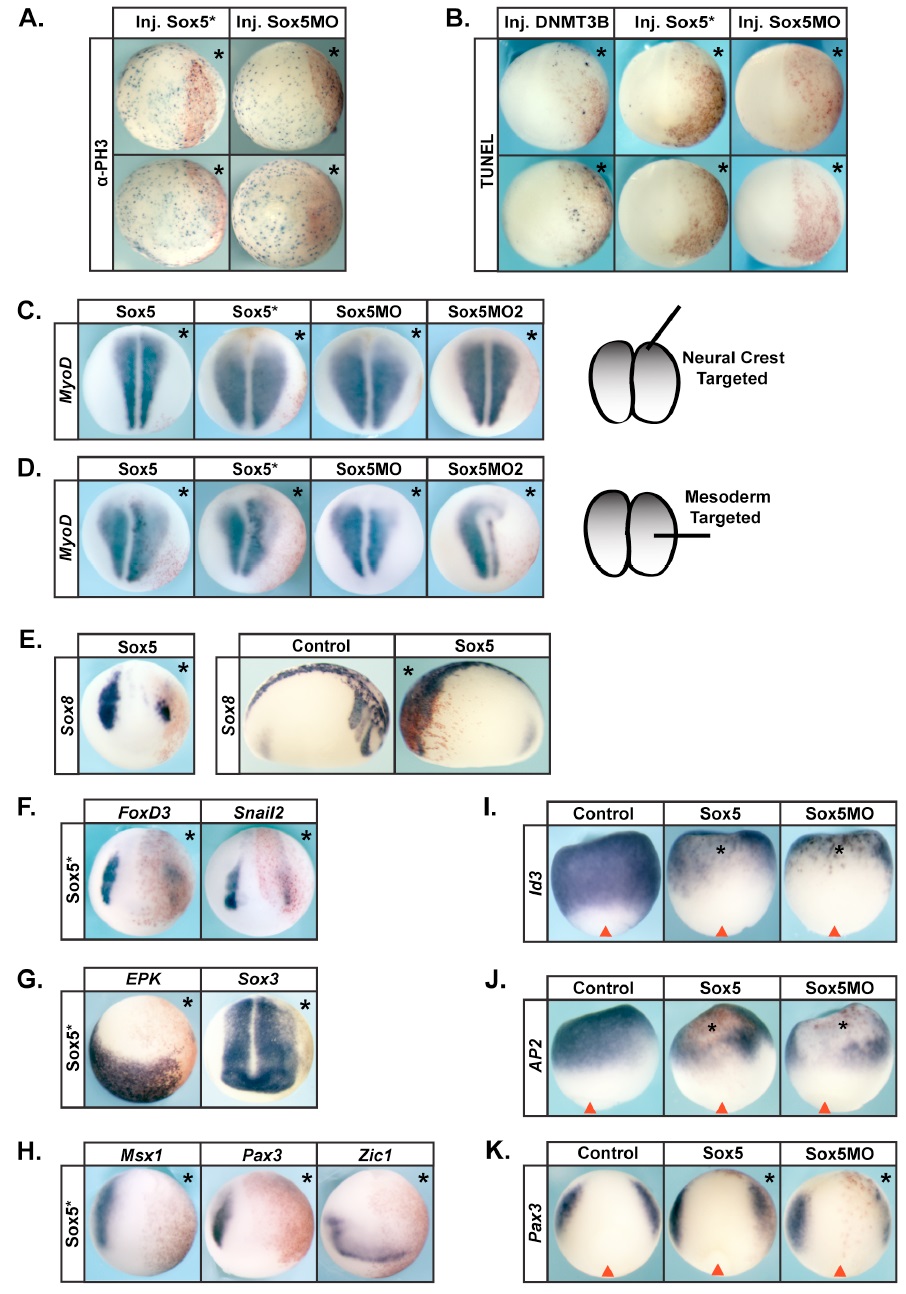 Figure S2. Related to Figure 2. Sox5 misexpression and knockdown causes gene expression defects in gastrula stage embryos. (A) phospho-Histone H3 staining of stage 15 embryos injected with Sox5 mRNA or Sox5 morpholino. No differences in proliferation are seen. (B) TUNEL staining stage 15 embryos injected with Sox5 mRNA or Sox5 morpholino. No differences in apoptosis are seen. DNMT3bmediated apoptosis serves as a positive control. Asterisk denotes side with β-gal staining (red) lineage tracer. (C) In situ hybridization examining expression of MyoD in stage 15 embryos injected with Sox5 mRNA or Sox5 morpholino in micromeres at the 8-cell stage targeting for ectodermal tissue that will give rise to neural crest. No defects in mesoderm are noted. (D) In situ hybridization examining expression of MyoD in stage 15 embryos injected with Sox5 mRNA or Sox5 morpholino in macromeres at the 8 cell stage targeting for mesoderm. Mesoderm formation as assayed by MyoD expression is perturbed, reflecting a role for Sox5 in this tissue. (E) In situ hybridization examining expression of Sox8 in embryos injected with Sox5 mRNA. Embryos were collected at both stage 17 and stage 23. (F) In situ hybridization examining expression of FoxD3 and Snail2 in embryos injected with Sox5* (a shorter Sox5 isoform/splice variant expressed in laevis). Embryos were collected at mid-neurula stages, stage 17. (G) In situ hybridization examining expression of EPK and Sox3 in embryos injected with Sox5*. Embryos were collected at early-neurula stages, stage 14. (H) In situ hybridization examining expression of Msx1, Pax3 and Zic1 in embryos injected with Sox5*. Embryos were collected at earlyneurula stages, stage 14. Sox5* behaved indistinguishably to Sox5 in these assays. (I-K) In situ hybridization examining expression of Id3 (I), AP2 (J) and Pax3 (K) at gastrula stages (stage 11.5) in embryos injected with Sox5 or Sox5MO. Red arrow denotes blastopore. Asterisk denotes injected side. |