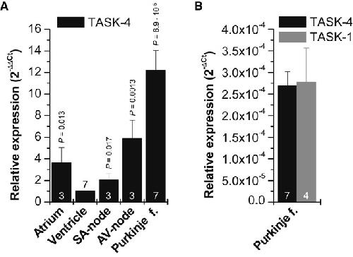 Figure 3. Expression pattern of TASK-4 in human cardiac compartments after quantitative RT-PCRRelative values normalized to ventricular expression. f., fibers. The relative expression was calculated by dividing means of Ct-values of each sample by mean Ct of ventricle and setting into . The experiments were performed as triplicates and averaged from three to seven repeats. Statistical significance is indicated compared to ventricular KCNK17 expression.Ct-values for KCNK17 (TASK-4) compared to KCNK3 (TASK-1) in Purkinje fibers after normalization for GAPDH.