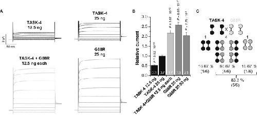 Figure 6. G88R mutant TASK-4 channel subunits have a dominant-active effect on wild-type TASK-4 subunitsRepresentative current voltage relationship measurements in Xenopus oocytes injected with wild-type TASK-4 cRNA (25 ng/oocyte, black), with 12.5 ng wild-type TASK-4 (mimicking haploinsufficiency), with wild-type TASK-4 and G88R-TASK-4 cRNA (12.5 ng each/oocyte, light gray) mimicking an heterozygous state or G88R mutant cRNA alone (25 ng/oocyte, gray). Voltage was stepped from a holding potential of −80 mV to potentials ranging from −100 mV to +60 mV in 20 mV increments. Voltage step duration was 200 ms and voltage steps were repeated every 2 s. Test pulses were followed by a step to −40 mV.Mean current amplitude at 0 mV is blotted relative to TASK-4 wild-type currents (25 ng). Relative TASK-4 current after injection of 20.83 ng G88R-TASK-4 cRNA is thought to resemble the theoretical amount of dimeric channels containing at least one G88R subunit (83.3%). Data are provided as mean ± SEM. P values calculated in unpaired Student's t-test are indicated. Numbers of independent experiments are indicated within the bars.Theoretical probability of dimeric subunit assembly after injection of similar amounts of wild-type and G88R-TASK-4 channel subunits.