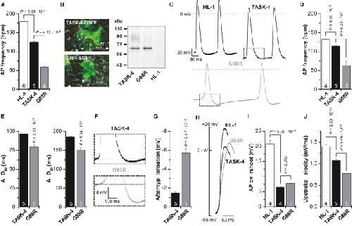 Figure 7. G88R mutants stabilize the membrane potential and slow upstroke velocity of spontaneously beating HL-1 cellsAction potential (AP) frequency, as beats per minute (bpm), of spontaneously beating HL-1 cells and of HL-1 cells transfected with TASK-4-EGFP or G88R-EGFP, was counted in supplemented Claycomb media. Beating frequency was determined from four to six independent transfections and dishes with untransfected HL-1 cells.Fluorescence imaging and Western blot analyses of HL-1 cells transfected with TASK-4-EGFP or G88R-EGFP. For Western blot analysis, TASK-4 or G88R was detected with an anti-GFP antibody. HL-1, non-transfected HL-1 cells.Patch clamp experiments in the current-clamp mode of HL-1 cells and HL-1 cells transfected with TASK-4-EGFP or G88R-EGFP. Boxes indicate the zoom area for panel F. The analyses of the patch clamp data in (D–J) were performed from four to five independent transfections for TASK-4 and G88R, respectively.Action potential (AP) frequency, as beats per minute (bpm), of spontaneously beating HL-1 cells and of HL-1 cells transfected with TASK-4-EGFP or G88R-EGFP, recorded in the current-clamp mode under physiological saline conditions.Analyses of the action potential duration, APD50 and APD90, of HL-1 cells transfected with TASK-4-EGFP or G88R-EGFP.Illustration of the hyperpolarization observed following an action potential of HL-1 cells transfected with TASK-4-EGFP or G88R-EGFP.Analyses of the afterhyperpolarization observed in HL-1 cells transfected with TASK-4-EGFP or G88R-EGFP.Illustration of the action potential overshoot and the upstroke velocity of HL-1 cells and of HL-1 cells transfected with TASK-4-EGFP or G88R-EGFP. Note that the threshold for the action potentials was not significantly different for the constructs.Analyses of the action potential (AP) overshoot of HL-1 cells and HL-1 cells transfected with TASK-4-EGFP or G88R-EGFP.Analyses of the upstroke velocity (mV/ms) of HL-1 cells and HL-1 cells transfected with TASK-4-EGFP or G88R-EGFP.