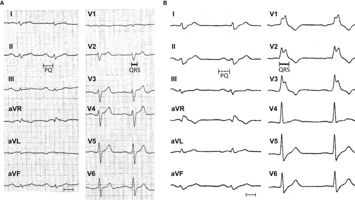 Figure 1. Twelve-lead electrocardiography (ECG) of a patient with progressive cardiac conduction disorder (PCCD) and idiopathic ventricular fibrillation (IVF)In 2003, heart rate (HR) 79 bpm, PQ interval 205 ms (marked by a dotted line), QRS 115 ms (continuous line), QT 351 ms, and corrected QT interval 402 ms.In 2008, HR 59 bpm, PQ interval 211 ms (dotted), QRS 166 ms (continuous), QT 433 ms, and QTc interval 427 ms (measurements each in lead II; paper speed 50 mm/s, scale bar 10 mm).