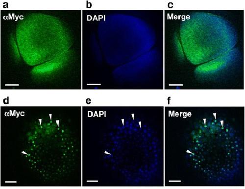 Figure 4. Localization of exogenous Cyclin E in pre-MBT and MBT Xenopus laevis embryos. One cell of 2-cell embryo was microinjected with in vitro transcribed Myc6−GFP-Cyclin E RNA, collected at indicated time points, and the translated protein detected in fixed and stained embryos. For immunofluorescence analysis of Cyclin E localization, embryos were collected at 4 hpf, pre-MBT (a-c) or at 6 hpf, MBT (d-f). (a, d) Embryos were fixed and stained with an antibody against the Myc6 tag (αMyc) followed by an Alexa488 conjugated secondary antibody. (b, e) Embryos were counterstained with DAPI to visualize the nuclei. (c, f). Merged image of the Alexa488 and DAPI. White arrowheads in d-f indicate nuclei. Embryos were viewed with a 10X objective on a Zeiss LSM 510 confocal microscope equipped with a META detector, and analyzed using LSM510 Image Acquisition software. Scale bars are 100 μM. At least 20 embryos were injected in at least 3 separate experiments, with at least 5 embryos fixed per timepoint for analysis.