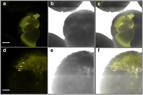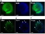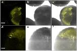 Figure 3. Localization of (QD564)-His6Cyclin E in live pre-MBT (4 hpf, 64-cell embryo, a-c) and MBT (6 hpf, 2048-cell embryo, d-f) Xenopus laevis embryos. One cell of embryos at the 2-cell stage was microinjected with (QD564)-His6Cyclin E and visualized using confocal microscopy. (a, d) fluorescence channel; (b, e) light channel; (c, f) merged fluorescence and light channels. Nuclei are marked with white arrowheads in panels b, f. Embryos were viewed with a 10X objective on a Zeiss LSM 510 confocal microscope equipped with a META detector, and analyzed using LSM510 Image Acquisition software. Scale bars are 100 μM. At least 20 embryos were injected and viewed in at least 3 separate experiments.