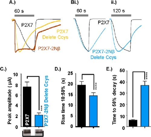 A, peak normalized traces showing the effect of deletion of the cysteine-rich region deletion from the P2X7 receptor (P2XYdelCcys, yellow) compared with the WT P2X7 receptor (black) and the P2X7–2Nβ chimera (red). ATP application is indicated by the gray bars (1 mm for 60 s). B, peak normalized traces showing reversion to slow receptor facilitation at the P2X7–2Nβ delCcys chimera (blue) with both 60-s (i) and 120-s (ii) applications of 1 mm ATP highlighting the faster desensitization of the chimeric receptor. C–E, histograms showing the peak amplitude (microamperes), rise time (seconds), and time to 50% decay (seconds) at the end of the ATP pulse for the P2X7 receptor versus the P2X7–2Nβ delCcys chimera. Western blots show equivalent levels of surface expression of P2X7 and the P2X7–2Nβ delCcys chimera. Data are mean ± S.E. (n = 4–25). ***, p < 0.001 ****, p < 0.0001. |