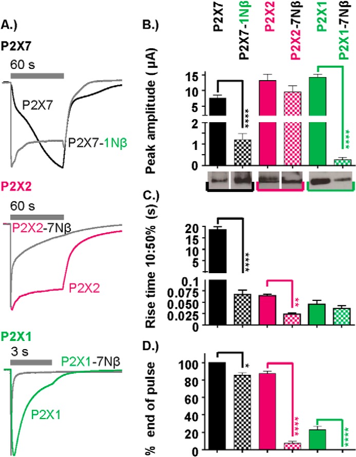 A, normalized traces demonstrating the effect on the time course of pre-TM1 β-region substitution of P2X1 into P2X7, P2X7 into P2X2, and P2X7 into P2X1 receptors, respectively. In each case, ATP was applied for the duration indicated by the gray bars (1 mm for P2X7 and P2X7–1Nβ and 100 μm for P2X1 and P2X2 WT receptors and chimeras). B—D, histograms showing the peak current amplitude (microamperes), 10–50% rise time (seconds), and percent current remaining at the end of the ATP pulse (EC90 concentration of ATP applied for the duration as indicated on the adjacent traces). Western blots show the surface expression of the respective WT and chimeric receptors. For P2X2 and P2X7 receptors, the lanes are from the same blot and exposure, and the white line between them indicates that they have been reordered from that loaded on the gel. Data are mean ± S.E. (n = 4–25). *, p < 0.05; **, p < 0.01; ****, p < 0.0001. |