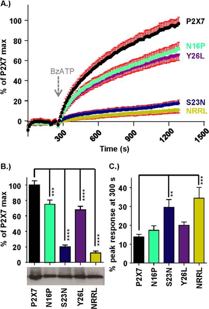 A, FlexStation responses demonstrating agonist-induced dye uptake through the pore of the P2X7 receptor and reduced dye uptake though the N terminus mutants N16P, Y26L, S23N, and NRRL. Agonist addition (300 μm BzATP) at 240 s is indicated by the arrow. Standard errors are only shown in one direction to not obscure the mean values. B, histogram summary showing the relative peak dye uptake for each receptor. Western blots show equivalent levels of surface receptor expression for P2X7 receptor WT and mutants. C, histogram summary demonstrating the amount of dye uptake (as a percentage of the peak maximum) 1 min after BzATP addition (300 μm BzATP addition made at 240 s). Data are mean ± S.E. **, p < 0.01; ***, p < 0.001; ****, p < 0.0001 (n = 24). |