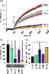 A, FlexStation responses demonstrating agonist-induced dye uptake through the pore of the P2X7 receptor, reduced dye uptake though the N terminus chimeric receptor, and C terminus deletion receptor (P2X7–2Nβ and P2X7 delCcys, respectively) and “P2X7-like” dye uptake through the P2X7–2Nβ delCcys mutant receptor. Agonist addition (300 μm BzATP) at 240 s is indicated by the arrow. S.E. is only shown in one direction to not obscure the mean values. Western blots show equivalent levels of surface expression for the P2X7 receptor WT and mutants. B, P2X7–2Nβ receptor response normalized to the peak P2X7 receptor response identifying an increased initial rate of dye uptake. C, P2X7–2Nβ delCcys receptor response normalized to the peak P2X7 receptor response demonstrating the relative dye uptake speeds through these two receptors. D, histogram summary showing the relative dye uptake for each receptor. E, histogram summary demonstrating the amount of dye uptake (as a percentage of the peak maximum) 1 min after BzATP addition (300 μm BzATP addition made at 240 s). Data are mean ± S.E. **, p < 0.01; ****, p < 0.0001 (n = 7–21). |