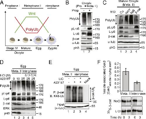 During Xenopus development, Wnt signaling is thought to function first after midblastula transition to regulate axial patterning via β-catenin-mediated transcription. Here, we report that Wnt/glycogen synthase kinase 3 (GSK3) signaling functions posttranscriptionally already in mature oocytes via Wnt/stabilization of proteins (STOP) signaling. Wnt signaling is induced in oocytes after their entry into meiotic metaphase II and declines again upon exit into interphase. Wnt signaling inhibits Gsk3 and thereby protects proteins from polyubiquitination and degradation in mature oocytes. In a protein array screen, we identify a cluster of mitotic effector proteins that are polyubiquitinated in a Gsk3-dependent manner in Xenopus. Consequently inhibition of maternal Wnt/STOP signaling, but not β-catenin signaling, leads to early cleavage arrest after fertilization. The results support a novel role for Wnt signaling in cell cycle progression independent of β-catenin.