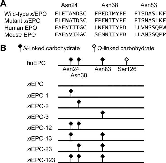 Erythropoietin (EPO), the primary regulator of erythropoiesis, is a heavily glycosylated protein found in humans and several other mammals. Intriguingly, we have previously found that EPO in Xenopus laevis (xlEPO) has no N-glycosylation sites, and cross-reacts with the human EPO (huEPO) receptor despite low homology with huEPO. In this study, we introduced N-glycosylation sites into wild-type xlEPO at the positions homologous to those in huEPO, and tested whether the glycosylated mutein retained its biological activity. Seven xlEPO muteins, containing 1-3 additional N-linked carbohydrates at positions 24, 38, and/or 83, were expressed in COS-1 cells. The muteins exhibited lower secretion efficiency, higher hydrophilicity, and stronger acidic properties than the wild type. All muteins stimulated the proliferation of both cell lines, xlEPO receptor-expressing xlEPOR-FDC/P2 cells and huEPO receptor-expressing UT-7/EPO cells, in a dose-dependent manner. Thus, the muteins retained their in vitro biological activities. The maximum effect on xlEPOR-FDC/P2 proliferation was decreased by the addition of N-linked carbohydrates, but that on UT-7/EPO proliferation was not changed, indicating that the muteins act as partial agonists to the xlEPO receptor, and near-full agonists to the huEPO receptor. Hence, the EPO-EPOR binding site in X. laevis locates the distal region of artificially introduced three N-glycosylation sites, demonstrating that the vital conformation to exert biological activity is conserved between humans and X. laevis, despite the low similarity in primary structures of EPO and EPOR.