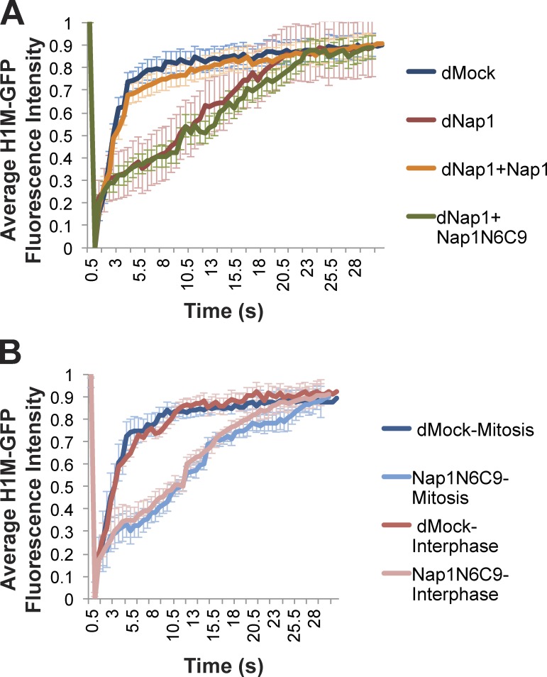 Figure 4. Glutamylation of Nap1 is required for proper H1 dynamics. (A) FRAP curves of H1M-GFP on mitotic chromosomes in metaphase-arrested egg extracts depleted of Nap1 (dNap1) and supplemented with either wild-type or the nonglutamylated mutant (Nap1N6C9). Curves represent means of n ⥠10 chromosomes from three separate extracts. Half-lives for fluorescence recovery (t1/2 ± SD; s): dMock = 1.7 ± 0.68, dNap1 = 8.6 ± 0.51, dNap1+Nap1 = 1.7 ± 0.60, and dNap1±Nap1N6C9 = 9.5 ± 0.69. (B) FRAP curves of GFP-H1 on chromatin in metaphase- or interphase-arrested egg extracts depleted of Nap1 and supplemented with Nap1N6C9. Regardless of cell cycle state, Nap1-depleted extract supplemented with Nap1 N6C9 caused a similar significant reduction in H1M recovery time. Curves are means of n ⥠10 chromosomes from five separate extracts. Half-times for fluorescence recovery (t1/2 ± SD; s): dMock-Mitosis = 1.9 ± 0.57, Nap1N6C9-Mitosis = 9.7 ± 0.67, dMock-Interphase = 2.1 ± 0.59, and Nap1N6C9-Interphase = 8.9 ± 0.70. For both A and B, the photobleach is plotted at time = 0.5 s. All curves were normalized to a baseline fluorescence of 1 at time = 0 s and 0 at time = 0.5 s. Error bars show ±SEM. |