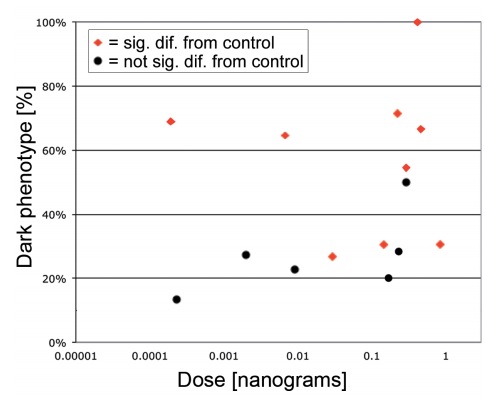 controls; red indicates a significant difference. Even as little as 0.5 picograms