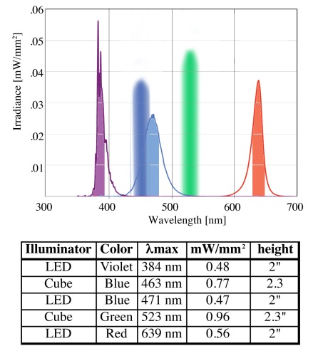 fiberoptically delivered LED lights inside light-tight cubes. Arrays comprised