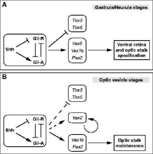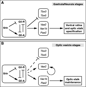 eye. (A) During gastrula/neurula stages of development, Hh signalling controls the specification of both the OS and VR domains by promoting expression of OS (Pax2, Vax1b) and VR (Vax2) genes and repressing expression of DR genes (Tbx3, Tbx5). (B) During optic vesicle stages, the expression domains of Vax2 and Tbx3/5 become less dependent on Hh signalling (dashed lines), which is required to maintain Pax2 and Vax1b expression and proper OS development. At both stages, activation of Hh signalling is likely to depend on the Shh ligand, acting through inhibition of Gli repressor proteins (Gli-R) and increase of Gli activator proteins (Gli-A) [40]. Vax2 was previously shown to self-activate its own expression at optic vesicle stages [29].