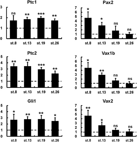 overexpression. Real-time PCR quantification of gene expression in st. 33 heads dissected from controls or from embryos injected with VP16-Gli1-GR mRNA and treated with dex from the indicated stages. Results are shown as the mean ratio between VP16-Gli1-GR-injected and control embryos in six independent experiments. Error bars show standard deviations. *Pâ<â0.05; **Pâ<â0.01; ns, non-significant (Pââ¥â0.05) according to two-tailed Studentâs t-test.