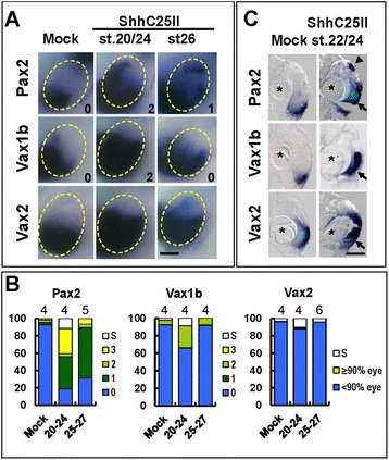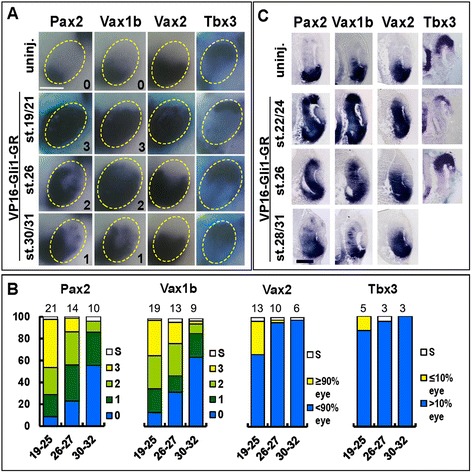 causes stage dependent effects on eye DV polarity. (A) Lateral views of heads of st. 33 embryos that were unilaterally injected with 250 pg of VP16-Gli1-GR mRNA at the eight-cell stage, treated with dex from the indicated stages and hybridized with probes for Pax2, Vax1b, Vax2 and Tbx3. Compared to the control side (uninj.), stage-dependent alterations in gene expression domains are detectable on the injected side. Light-blue β-gal staining identifies the injected side. Scale bar, 200 μm. (B) Quantification of the percentages of embryos with different effects on gene expression domains or eye reductions (S) in each treatment condition. The number of experiments performed for each probe and treatment condition is indicated on top of the corresponding histogram bar. (C) Histological sections of eyes of st. 33 embryos treated as in (A) and (B), and hybridized with the indicated probes, confirming stage dependent gene expression changes as detected in whole mount views. Scale bar, 100 μm.