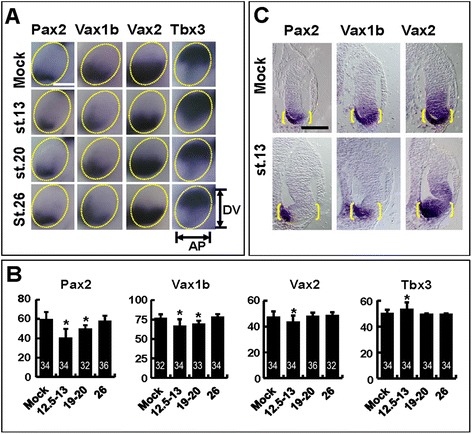 PMP treatments cause stage dependent effects on eye DV polarity. (A) Lateral views of heads of st. 33 embryos treated with DMSO (mock) or 300 to 600 μM PMP from the indicated stages and hybridized with probes for Pax2, Vax1b, Vax2 or Tbx3. In mock-treated embryos, wild-type expression patterns of these genes are detectable: Pax2 and Vax1b staining is restricted to the OS, Vax2-positive region covers the OS and VR, Tbx3 expression identifies the DR. PMP treatments affect gene expression domains to various degrees depending on the stage of delivery (st. 8 to 10, blastula-early gastrula; st. 12.5 to 14, late gastrula-early neurula; st. 19 to 22, late neurula-early optic vesicle; st. 26, mid optic vesicle). For Pax2 and Vax1b, embryos were grouped into 0 to 3 scores (numbers at the bottom right corner of each image) as explained in the âResultsâ section and representative eyes for each score group are shown. See text for details. The broken yellow circles highlight the eye region. Scale bar, 200 μm. (B) Quantification of the percentages of embryos stained for Pax2 or Vax1b with 0 to 3 scores in each treatment condition. Embryos stained for Vax2 or Tbx3 were grouped according to the DV extent of Vax2/Tbx3 expression domain (more or less than 90% of the eye for Vax2; more or less than 10% of the eye for Tbx3). The percentages of embryos with strong eye reductions are also indicated (S, small eyes). The number of experiments performed for each probe and treatment condition is indicated on top of the corresponding histogram bar. At least 20 eyes/10 embryos were analysed for each experiment. (C) Histological sections of eyes of st. 33 embryos treated as in (A) and (B), and hybridized with the indicated probes, confirming stage dependent alterations in the expression domains of Pax2, Vax1b, Vax2 and Tbx3 as detected in whole mount views. Scale bar, 100 μm.