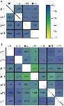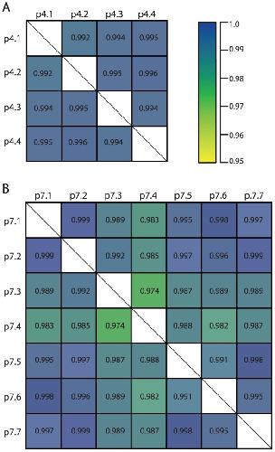 Figure 3. Correlation matrices displaying Pearson's correlation values for scaled coverage plots quantitatively demonstrate high correlations between invitrosome experiments.3A Pearson's correlation matrix for coverage plots from plasmids p4.1-p4.4. 3B Pearson's correlation matrix for coverage plots from plasmids p7.1-p7.7. In both matrices, high to lower correlation values range in color from blue to yellow as show.