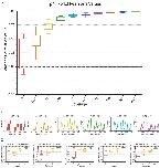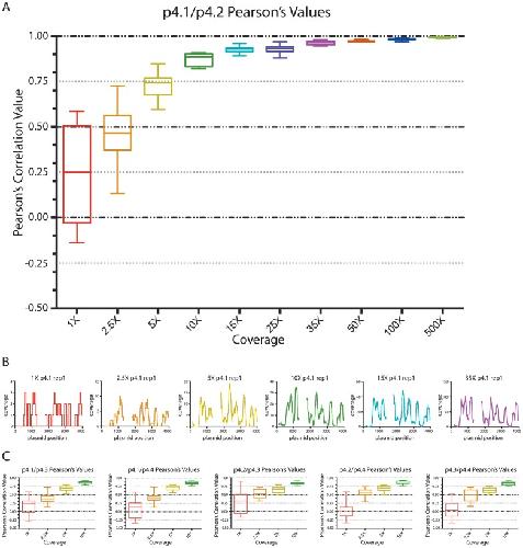 Figure 5. Comparison of correlation values show minimal acceptable coverage levels for invitrosome experiments.5A Range of correlation values at each coverage level for the pair-wise comparisons of the three replicates for plasmid p4.1 and the three replicates for plasmid p.4.2. The Pearson's correlation values are on the y-axis and the coverage levels are on the x-axis. The range of correlation values for each coverage level is plotted as a whisker plot composed of the 30 pair-wise comparisons at each coverage level. 5B Coverage plots for replicate 1 of plasmid p4.1 at coverage levels: 1X, 2.5X, 5X, 10X, 15X and 35X. The colors of the coverage plots correspond to the whisker-plot colors of the same coverage levels in 5A. 5C Whisker plot graphs showing the variability of correlation values at low levels of coverage (1X-10X) for all combinations of the kat-group plasmids. In 5A–5C the colors red, orange, yellow, green, indigo and purple represent data from coverage levels of 1X, 2.5X, 5X, 10X, 15X and 35X, respectively.